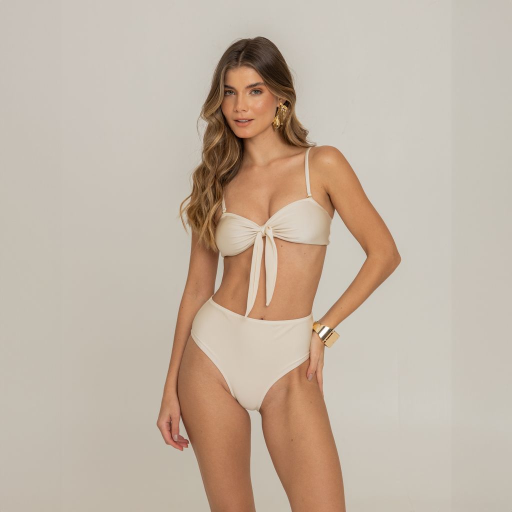Top fixo com bojo com duas opções de uso (com e sem nó frontal) e calcinha cintura alta, ampla cobertura de bumbum.